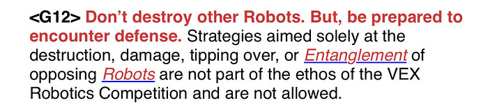 That second part is fair,that’s just poor design choices on their part they’re almost guaranteed to get tipped like that, but the first part is irrelevant. It is not the robot design but the strategy that is designed to tip that is illegal, as defined in G12. So if your intent from an action was to tip them over, and you succeeded, that could be seen as intentionally tipping an opposing robot and hence a violation of G12.